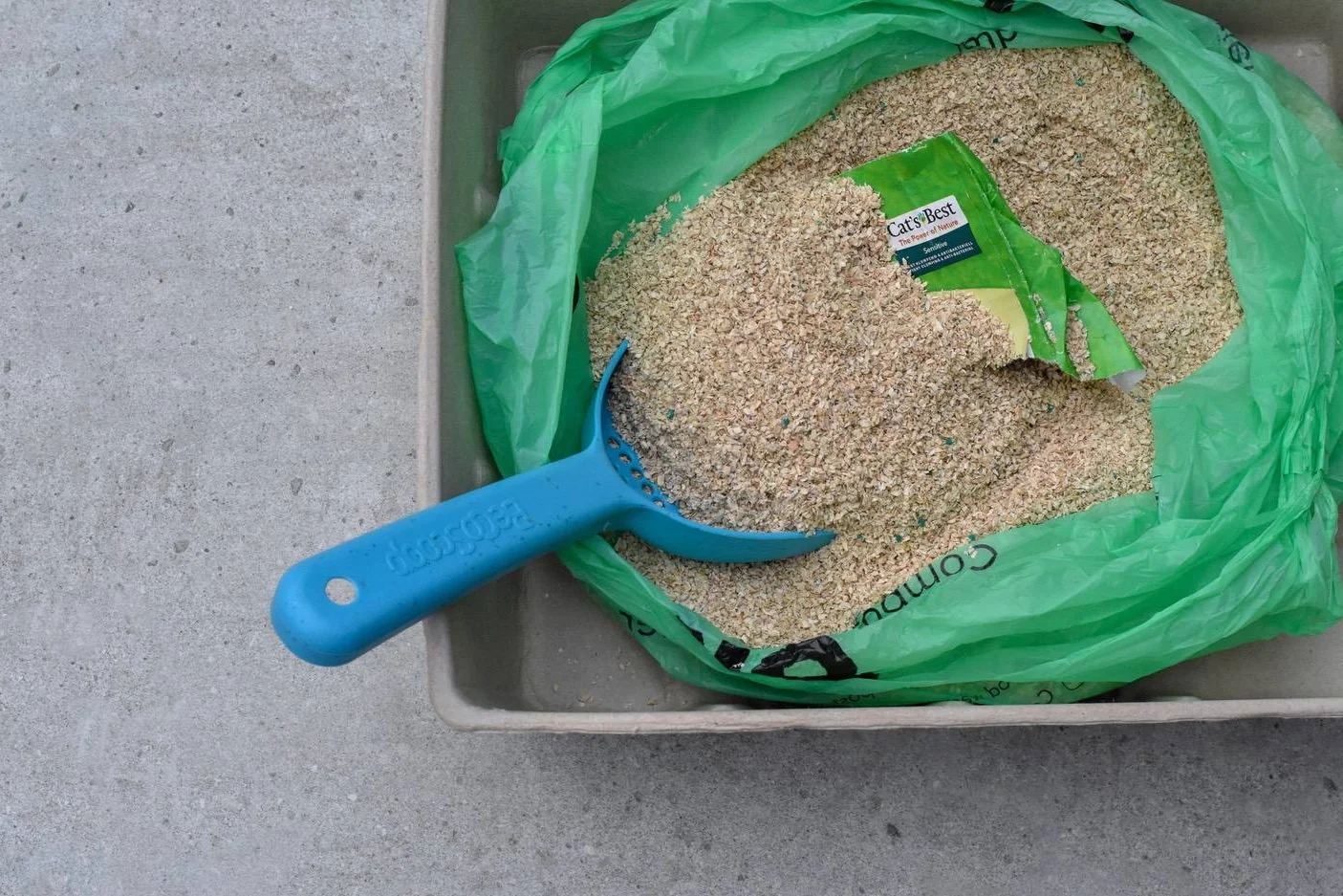 After a few failed attempts at finding something a, compostable b, flushable, c, non-stinky, d, long lasting and e, accepted by our cats, we’ve found this stuff - Cat’s Best - to be brilliant, which we use it with a biodegradable bamboo scoop. The litter box in the picture is compostable, but it’s only really useful if you’re travelling (it’s tiny). Beco Pets make a proper sized one made out of recycled bamboo!